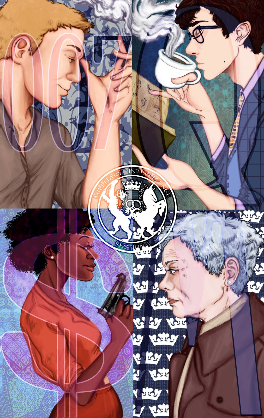 James Bond, Q, Eve Moneypenny, and M